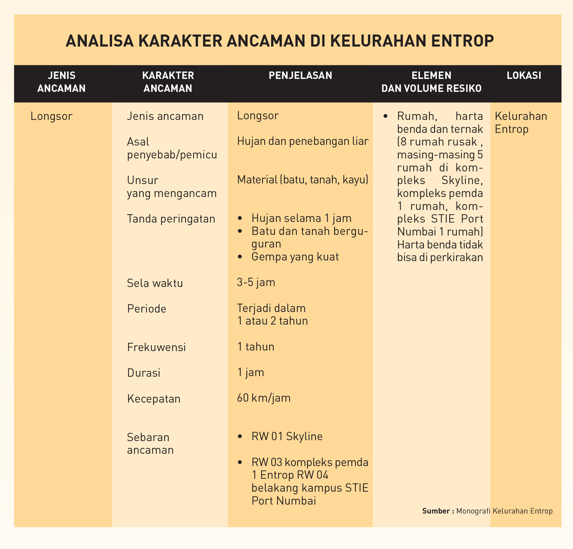 Di Entrop, misalnya, berdasarkan data yang ada, wilayah ini rawan dilanda banjir dan longsor. Bencana banjir pernah terjadi di Entrop pada 1996, 1999, dan 2000. Penyebabnya, masyarakat adat menjual tanah yang merupakan daerah serapan air kepada pemerintah untuk dibangun sebagai tempat permukiman, pertokoan, kantor, dan lain-lain.