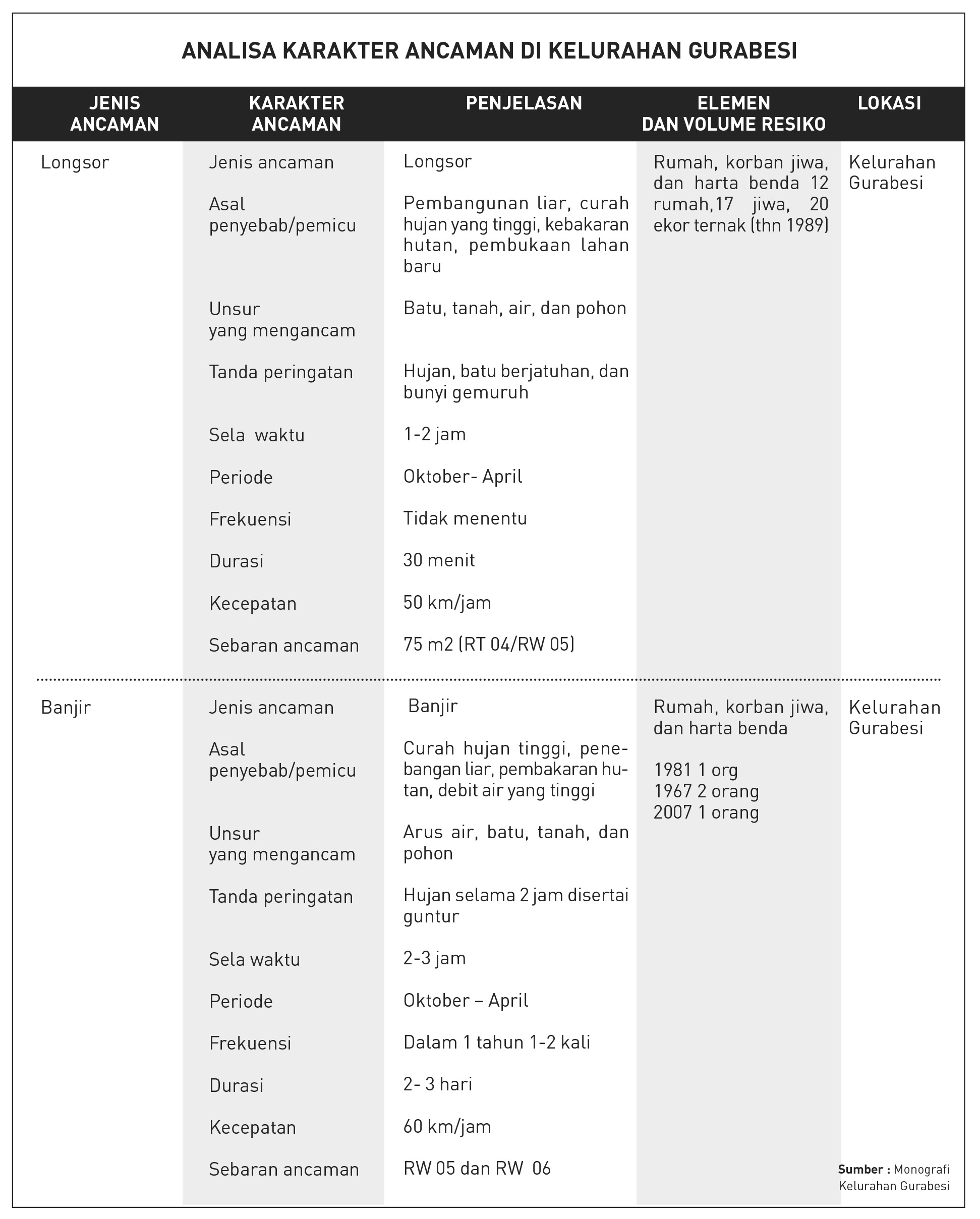 Berdasarkan catatan, banjir di Kelurahan Gurabesi pernah terjadi pada 1967, 1985, dan 2007. Bencana longsor terjadi pada 1980, 1985, dan 2007. Sedangkan, kebakaran terjadi pada 1968, 2004, dan 2009. Kejadian-kejadian tersebut telah memberikan dampak dan menimbulkan kerugian besar, baik korban jiwa, permukiman, dan harta benda.