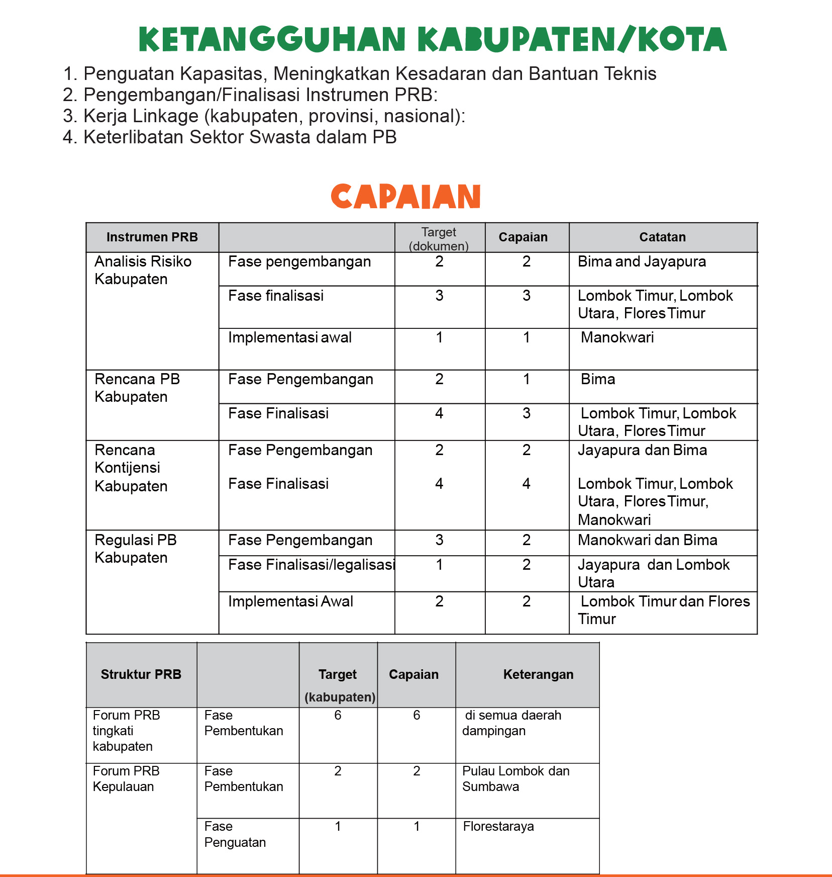 Di level pemerintahan, ada sejumlah dokumen yang berhasil dihasilkan di tingkat kabupaten. Di antaranya Peraturan Daerah (Perda) No. 3 Tahun 2012 tentang Penanggulangan Bencana di Kabupaten Lombok Timur.