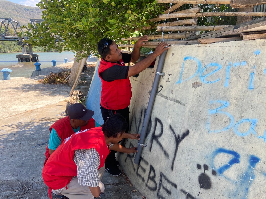 Relawan SIBAT Kelurahan Baru, Kecamatan Reok, Kabupaten Manggarai, NTT menunjukkan cara kerja sensor alat early warning system yang dipasang di pinggir Sungai Wae Pesi. (Foto/Chairul Akhmad)